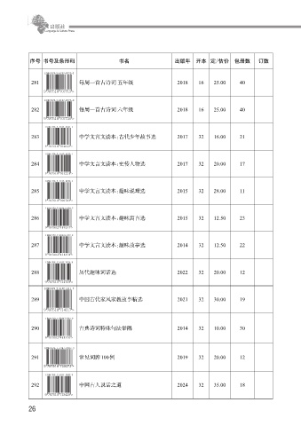 序号 书号及条形码 书名 出版年 开本 定/估价 包册数 订数