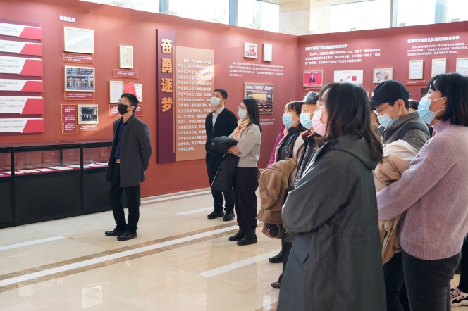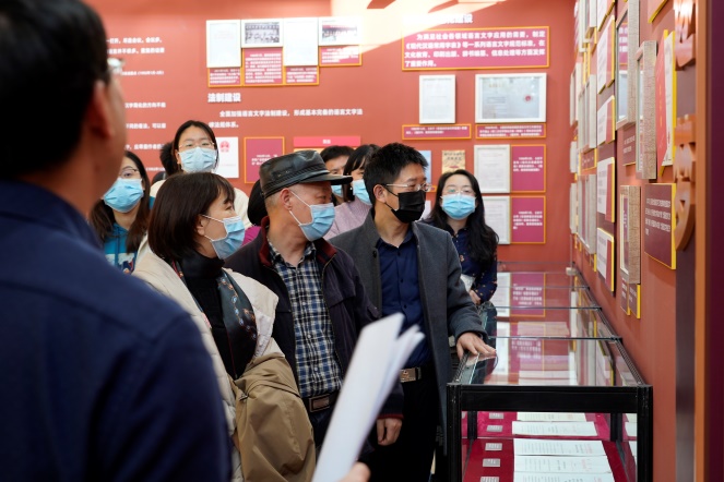 跟随着讲解,大家集体参观了“星火燎原”“日月新天”“与时俱进”“奋勇逐梦”四个篇章,通过照片、档案、图书、实物、音视频资料等素材,进一步了解了党领导下的语言文字政策和实践的变迁、发展进程,深刻感悟新民主主义革命时期、社会主义革命和建设时期、改革开放和社会主义现代化建设新时期、中国特色社会主义新时代党领导的语言文字事业取得的显著成就。