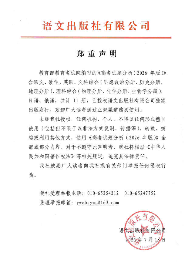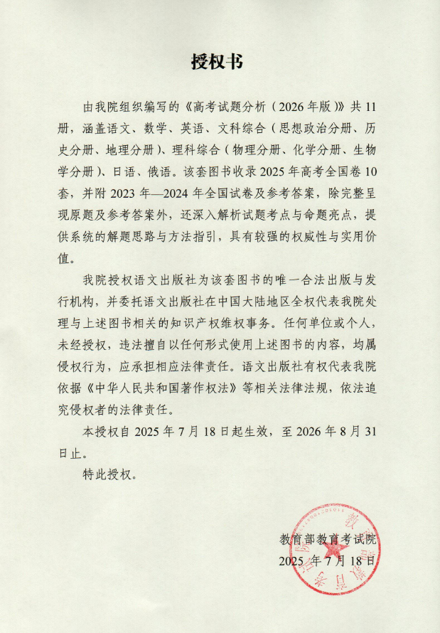 《高考试题分析(2026 年版)》由教育部教育考试院授权语文出版社独家出版发行。目前出现了侵权盗版现象,严重影响该系列图书的品牌声誉和正版销售。为依法维护著作权人及我社合法权益,特发布郑重声明和授权书。