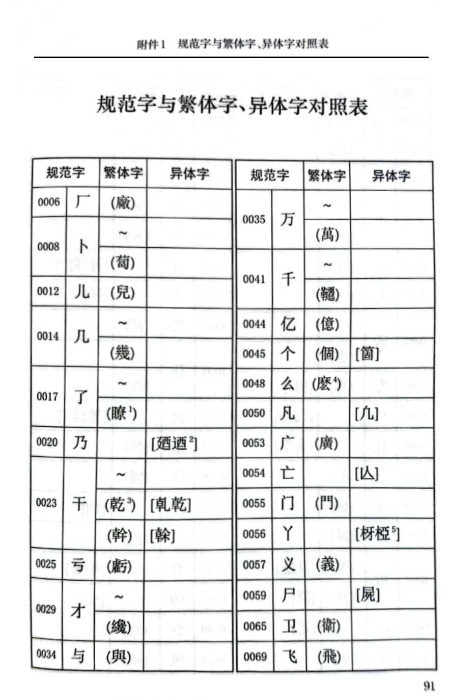 选自本书附录1《规范字与繁体字、异体字对照表》