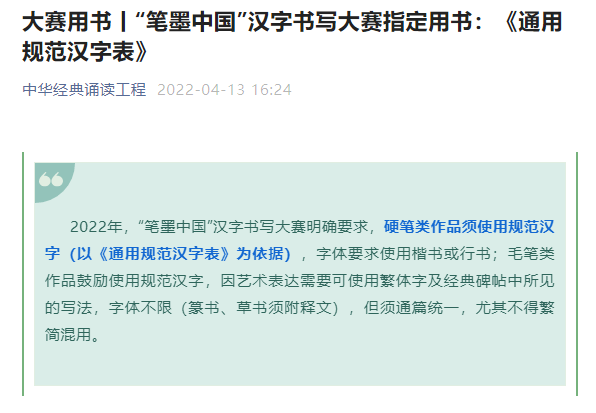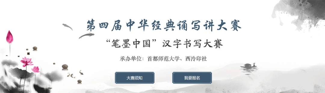 第四届中华经典诵写讲大赛“笔墨中国”汉字书写大赛简介:汉字和以汉字为载体的中国书法是中华民族的文化瑰宝,是人类文明的宝贵财富。为激发社会大众特别是青少年对汉字书写的兴趣,提高规范使用汉字的意识和能力,传承弘扬中华优秀文化,特委托首都师范大学、西泠印社出版社承办“笔墨中国”汉字书写大赛。