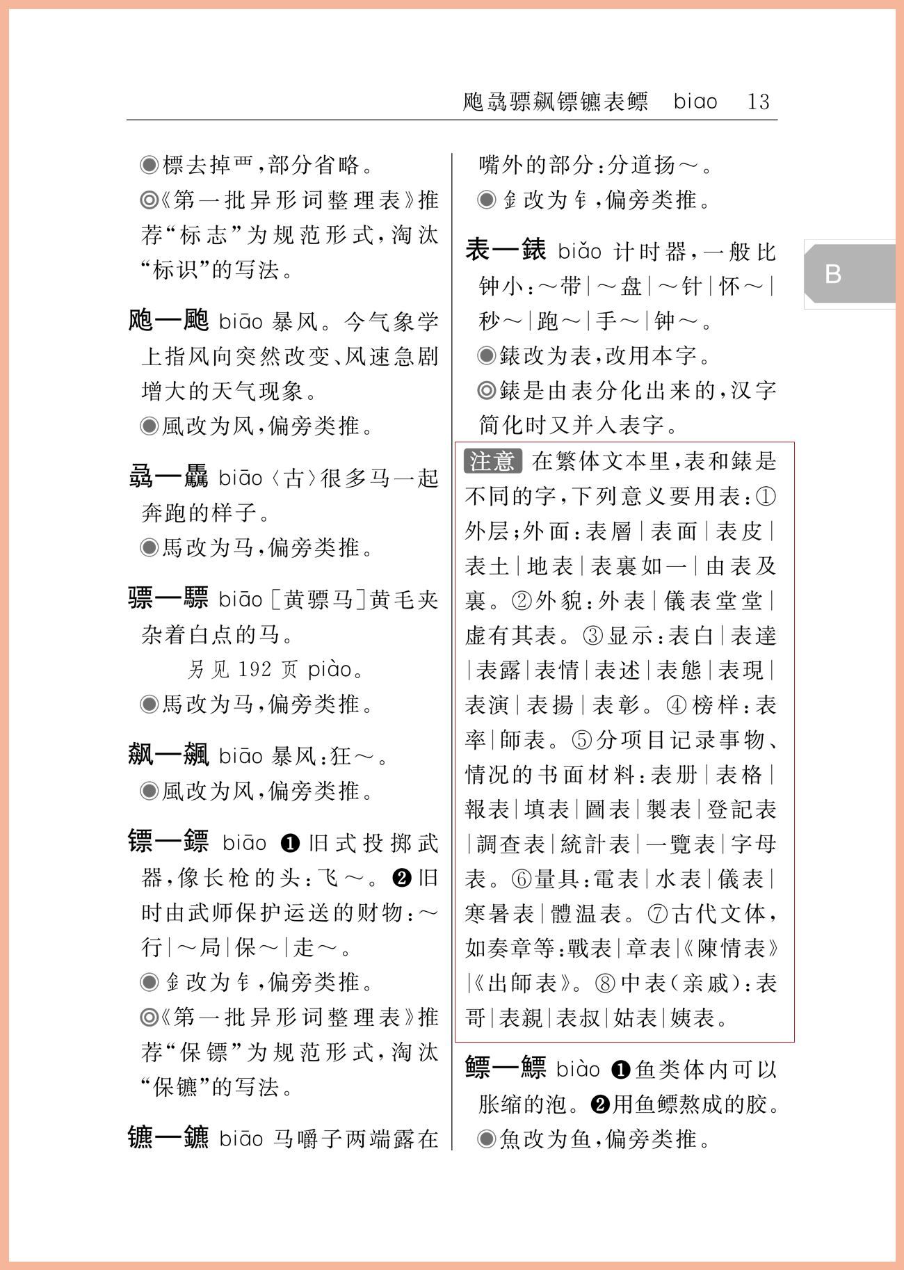 设置“注意”栏,主要用来说明简化字与繁体字之间存在的复杂关系,帮助读者正确进行简繁转换或繁简转换。有的则指明字音、字形上值得注意的问题。